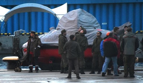 | Des membres des équipes de recherche, le 26 décembre dans le port de Sotchi |