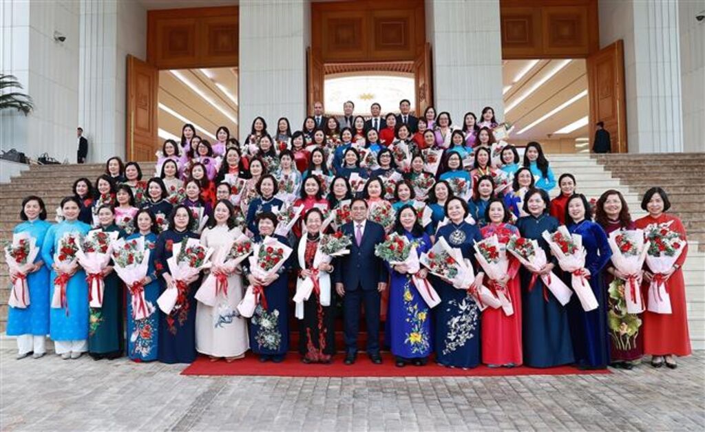 | Le Premier ministre Pham Minh Chinh et les déléguées, le 7 mars à Hanoï. |