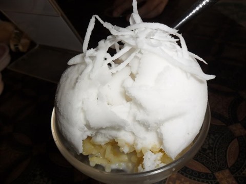• Maintenant, mettre le xôi dans un petit bol. Avec un scooper faire une belle boule de crème glacée. Saupoudrer d’un peu de sésame torréfié et de noix de coco râpée.