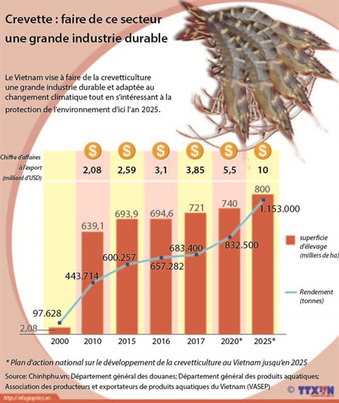 Le Vietnam vise à faire de la crevetticulture une grande industrie durable et adaptée au changement climatique tout en s’intéressant à la protection de l’environnement d’ici l’an 2025.