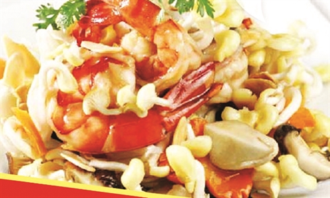 4. Verser l’huile dans un wok à feu vif. Une fois bien chaude, faire revenir brièvement les oignons, puis ajouter les crevettes, les volvaires, les betteraves et les carottes, et sauter le tout rapidement. Réduire le feu, ajouter deux c.à.s d’eau, le nuoc mam, le hat nêm, et les ngo gai. Poivrer. Cuire quelques minutes en mélangeant, rectifier le cas échéant, puis servir.
