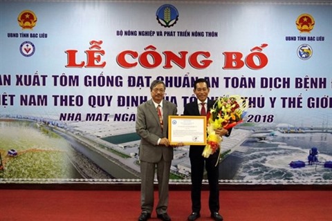 Lors de cette cérémonie, le vice-ministre de l’Agriculture et du Développement rural, Phùng Duc Tiên, a applaudi les efforts du groupe Viêt-Uc, qui a appliqué sérieusement et pleinement les mesures de gestion, de biosécurité et de sécurité épidémique de l’OIE dans la production de crevettes.