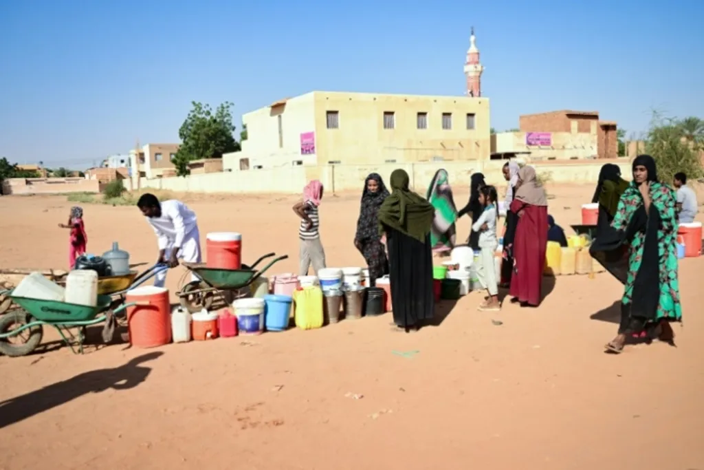 | Des Soudanais font la queue pour s'approvisionner en eau à Omdurman, la ville jumelle de la capitale Khartoum, durant des combats entre l'armée et les paramilitaires des FSR, le 16 janvier. |
