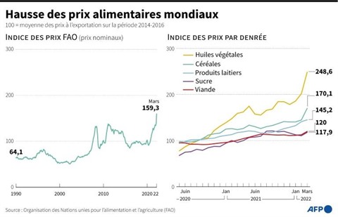 Selon la FAO, le principal facteur à l'origine de cette hausse est que la Russie et l'Ukraine sont toutes deux d'importants producteurs de blé et de céréales secondaires, dont les prix se sont envolés en raison du conflit. Les inquiétudes concernant l'état des cultures aux États-Unis ont également joué un rôle, selon la FAO. Les prix du riz, quant à eux, sont restés pratiquement inchangés par rapport à février.