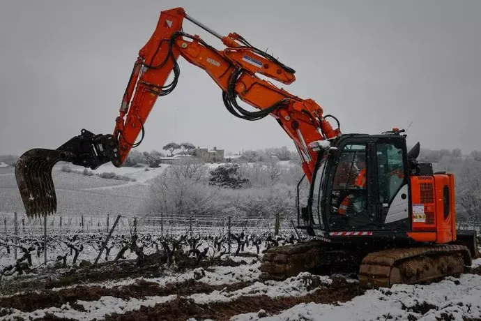 | Une pelle arrache des vignes à Haux, à environ 25 km au sud-est de Bordeaux, le 18 janvier 2023. |
