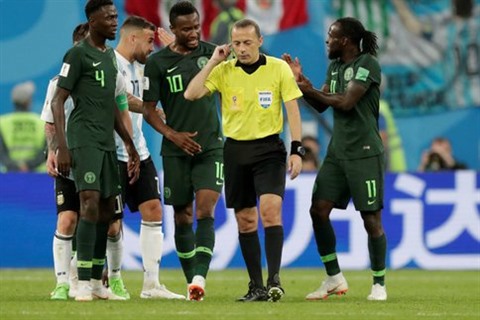 | L'arbitre turc Cuneyt Cakir (2e, droite) lors du match Argentine-Nigeria du premier tour. |