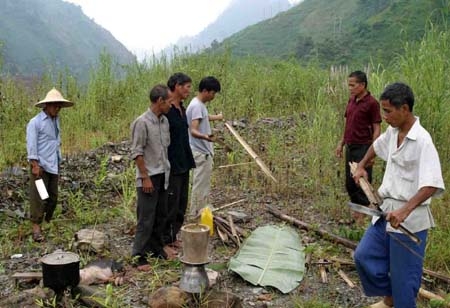 Abattage d’un poulet pour le culte des ancêtres, puis organisation d’une cérémonie pour arroser le sacrifice. Un jeune couple de l’ethnie Mang peut ensuite s’installer dans sa nouvelle maison. Photo : TT/CVN