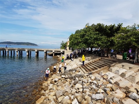 | Les élèves ramassent des ordures dans la zone littorale aux îles Chàm. |