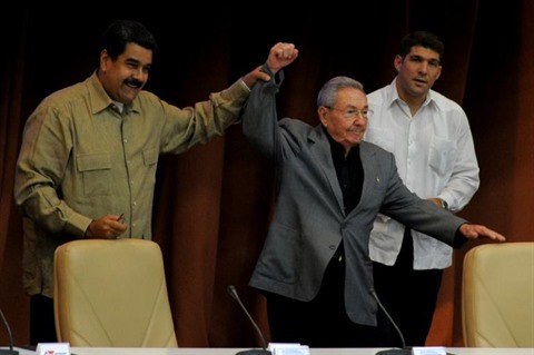 | Le président cubain Raul Castro (droite) et le président vénézuelien Nicolas Maduro, |