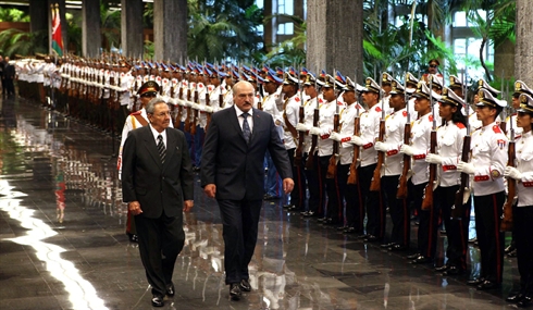 | Le président bélarusse Alexander Lukashenko (droite) et le dirigeant cubain, Raul Castro passent la revue de la garde d'honneur, le 25 juin à La Havane. Photo : AFP/VNA/CVN |