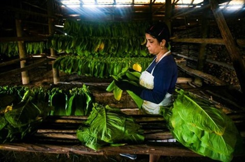 | Une femme prépare les feuilles pour être séchées dans un séchoir à tabac, le 17 février à San Juan et Martinez, dans la province de Pinar del Rio, à Cuba. |