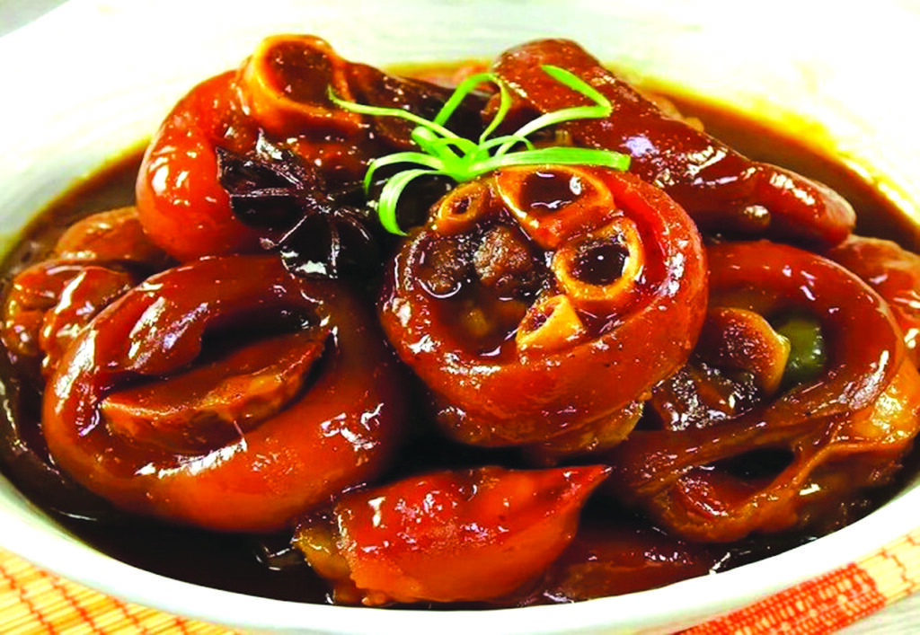 - Dans une poêle/un wok, verser 3 c.à.s de l’huile à feu doux puis faire frire la cuisse de porc jusqu’à ce qu’elle devienne dorée et bien parfumée. Cela rend la couenne moins graisseuse et apporte plus de goût après la cuisson. Sortir.