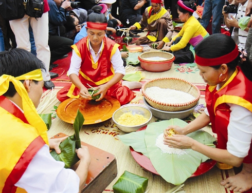 | Concours de préparation du bánh chung (gâteau carré de riz gluant traditionnel vietnamien symbolisant la Terre) et du bánh dày (gâteau rond de riz gluant pilé symbolisant le Ciel). |