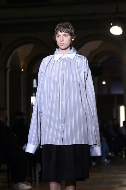Tailleurs-jupes noirs structurés, robes amples, chemises à rayures aux manches trop longues, blousons oversize : le créateur, qui a récemment rejoint Miuccia Prada à la tête de la maison italienne, a présenté sa propre marque, dans un défilé au Palais Brongniart, l'ancienne Bourse de Paris.