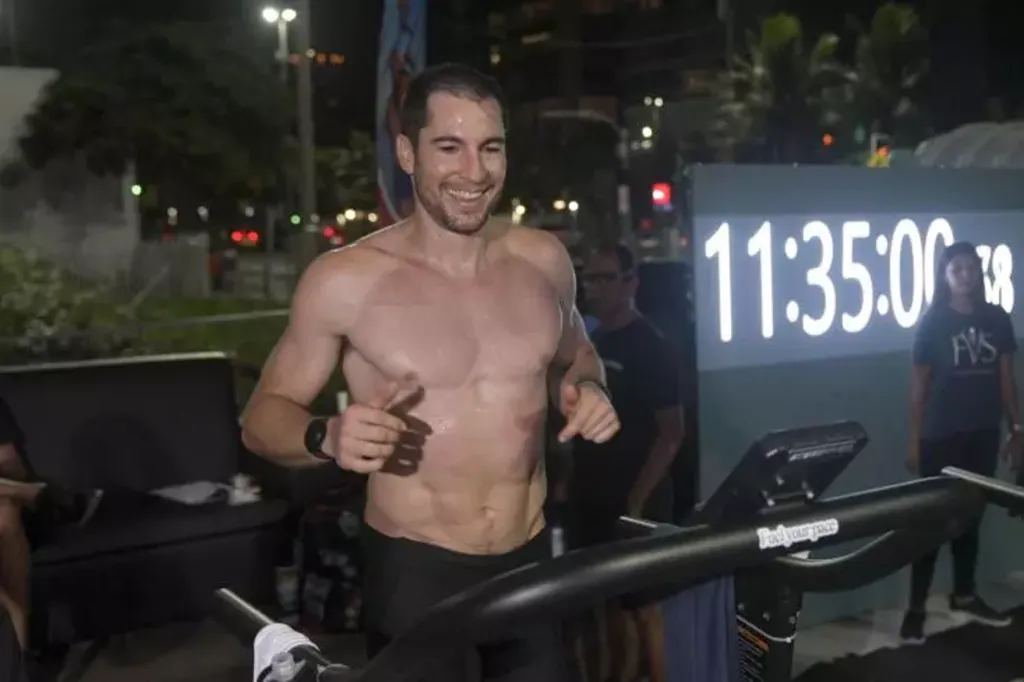 Sur un tapis installé dans une salle de sport à ciel ouvert avec vue sur la légendaire plage d'Ipanema, à Rio de Janeiro, il a bouclé une distance plus longue que quatre marathons à 9h00 du matin, même heure à laquelle il avait commencé mercredi 4 février.