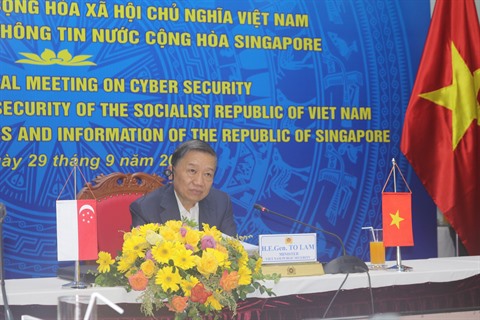 | Le ministre vietnamien de la Police, Tô Lâm, lors de l’entretien virtuel avec le ministre singapourien de la Communication et de l'Information |