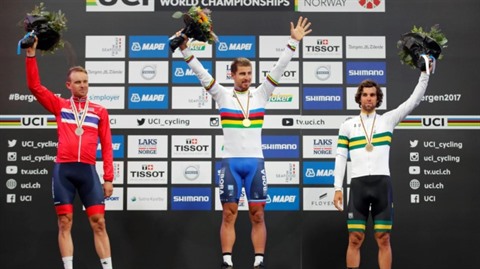 | Peter Sagan, désormais triple champion du monde en titre, le 24 septembre après sa victoire à Bergen avec le dauphin norvégien Alexander Kristoff et le 3e australien Michael Matthews. |