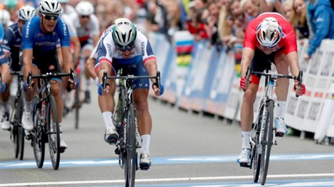| Devant le Norvégien Alexander Kristoff (droite), le Slovaque Peter Sagan remporte pour la troisième fois en trois ans le titre de champion du monde de cyclisme, le 24 septembre à Bergen. |