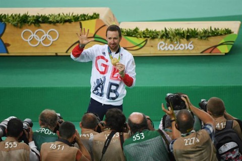 | Bradley Wiggins médaillé d'or avec l'équipe britannique lors des Jeux Olympiques de Rio, le 12 août. |