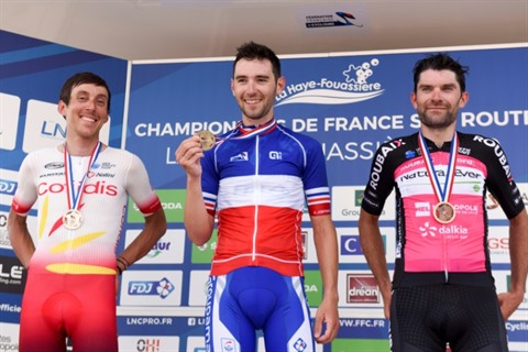 | Le podium du Championnat de France du contre-la-montre (gauche à droite): Stéphane Rossetto (médaille d'argent), Benjamin Thomas (médaille d'or) et Julien Antomarchi (médaille de bronze), le 27 juin à La Haie-Fouassière, près de Nantes. |