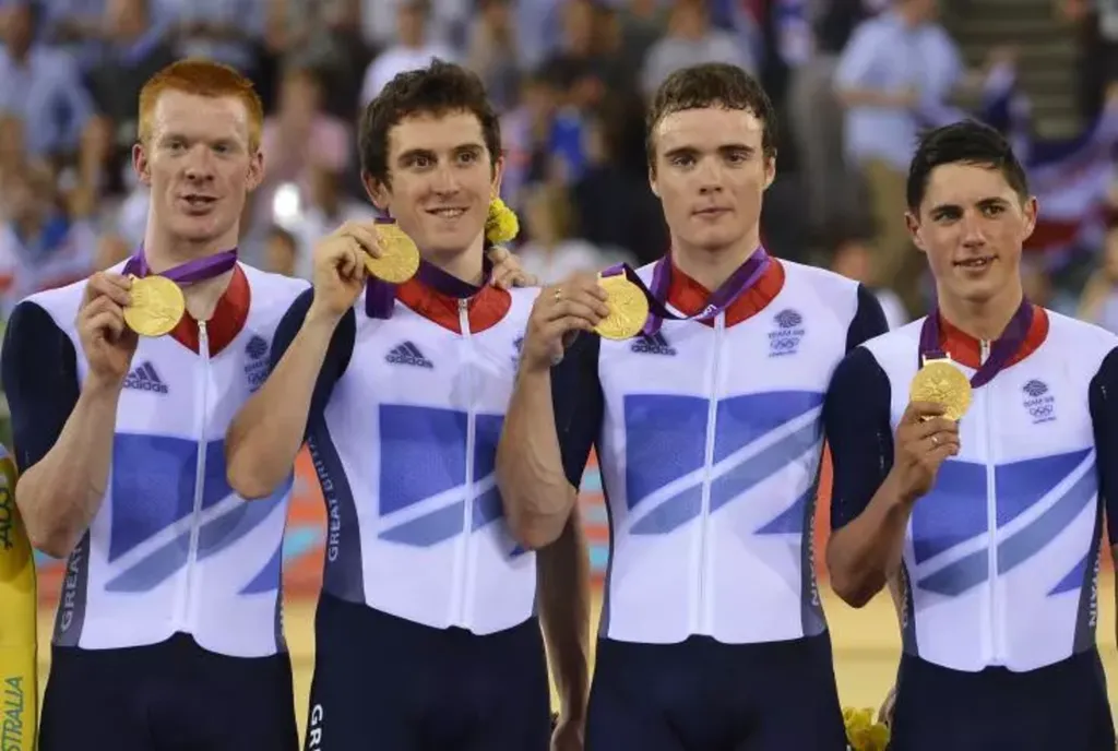 | L'équipe de Grande-Bretagne avec Geraint Thomas (deuxième à gauche), championne olympique de la poursuite à Londres. |