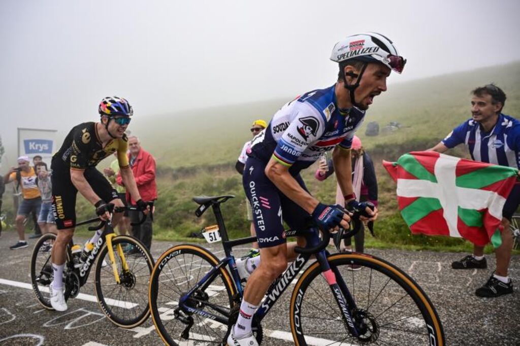 | Julian Alaphilippe devant le Belge Wout Van Aert dans l'ascension du Col de Soudet lors de la 5e étape du Tour de France le 5 juillet 2023. |