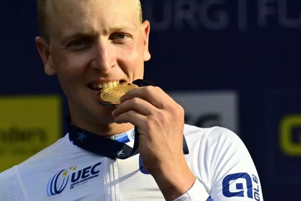 | Le Belge Tim Merlier après sa victoire lors des championnats d'Europe de cylisme, le 15 septembre à Hasselt en Belgique. |