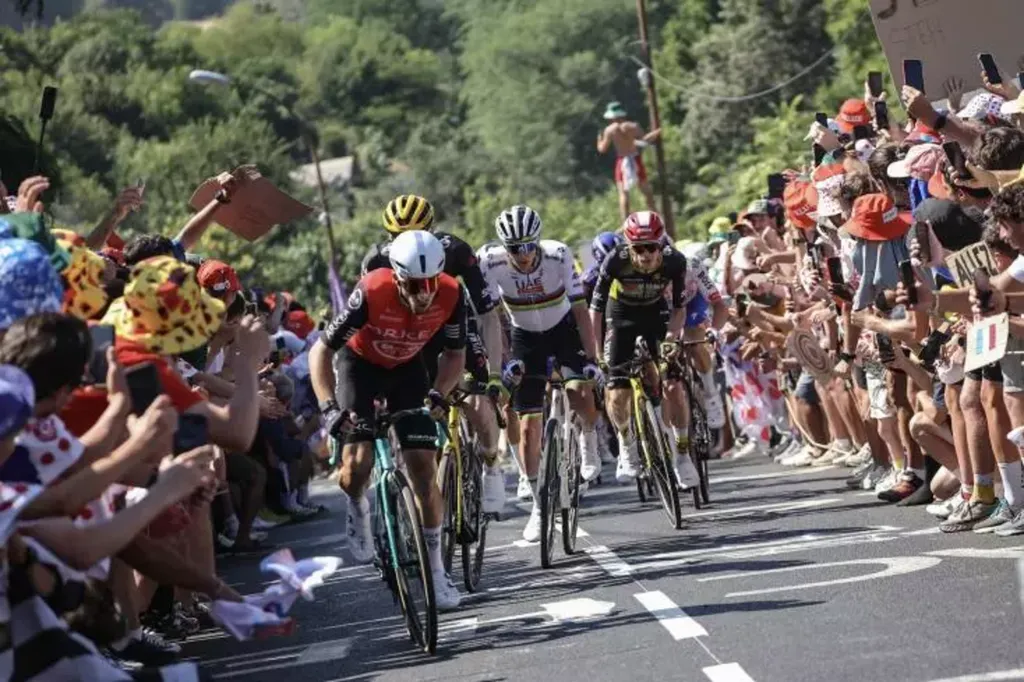 | Kevin Vauquelin à l'attaque devant Tadej Pogacar et Jonas Vingegaard dans la Côte de Pech David le 16 juillet lors de la 11e étape du Tour de France. |