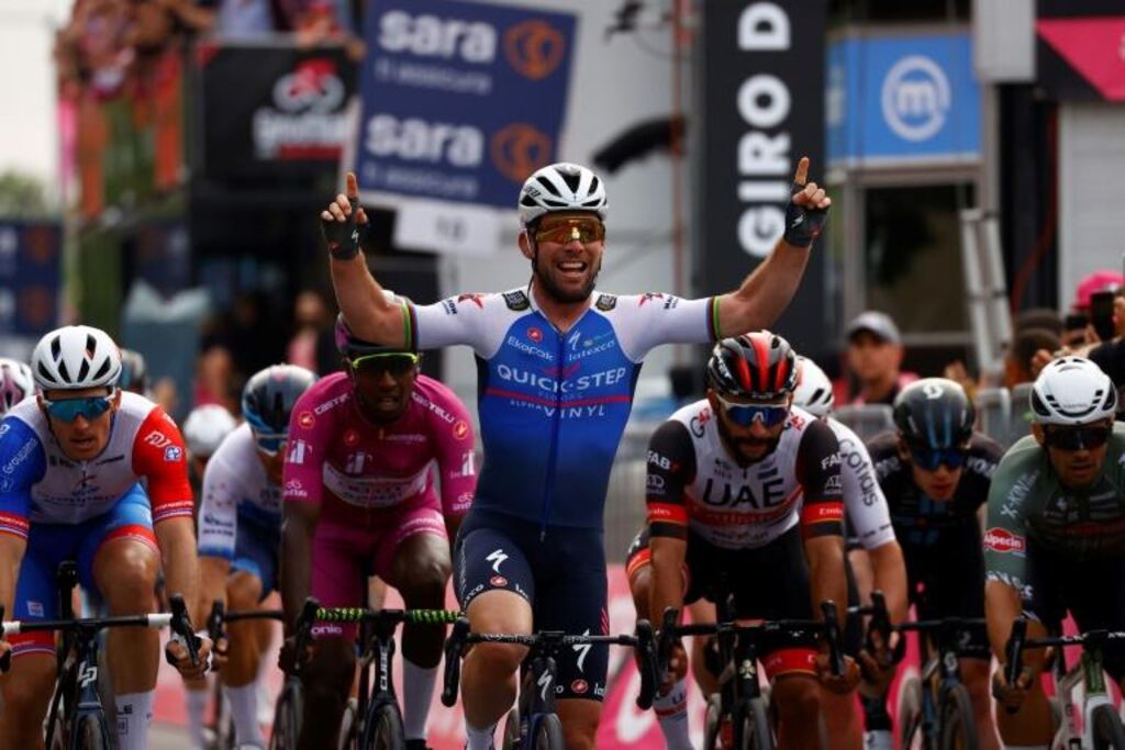 | Le coureur britannique Mark Cavendish (Quick-Step) lève les bras en vainqueur sur la ligne d'arrivée d'une étape du Tour d'Italie, le 8 mai à Balatonfured (Hongrie). |