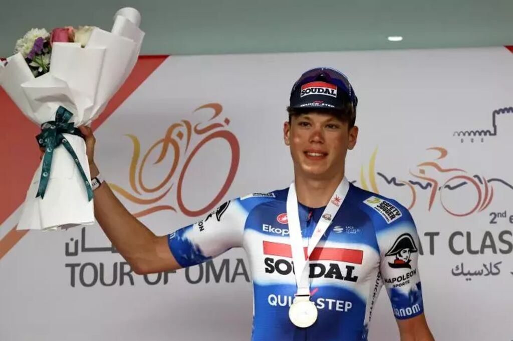 | Paul Magnier (Soudal Quick-Step), sur le podium, après sa victoire dans la 3e étape du Tour d'Oman, à Mascate. |