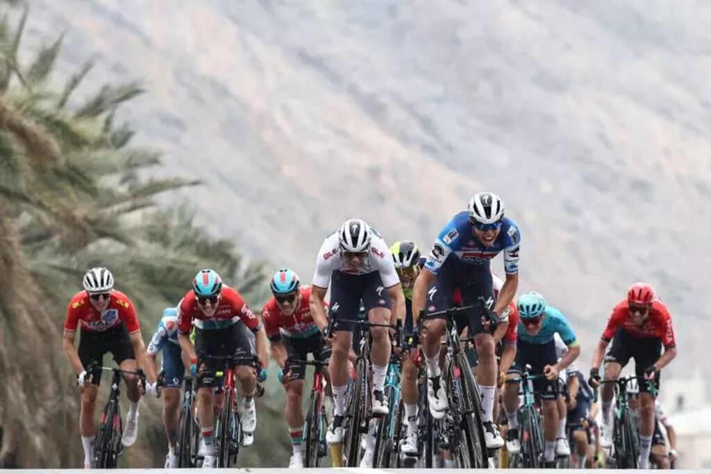 | Paul Magnier (Soudal Quick-Step) sprinte jusqu'à la ligne d'arrivée devant l'Américain Luke Lamperti (Soudal Quick-Step) pour remporter la troisième étape du Tour d'Oman, à Mascate le 12 février. |