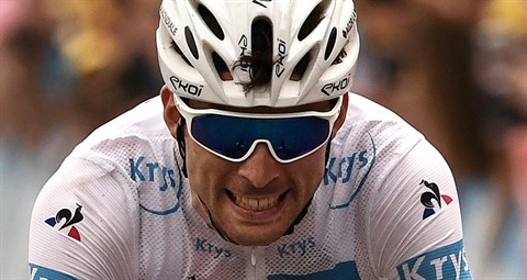 | Le Français Pierre Latour, maillot blanc (meilleur jeune) du Tour de France, le 27 juillet entre Lourdes et Laruns. |