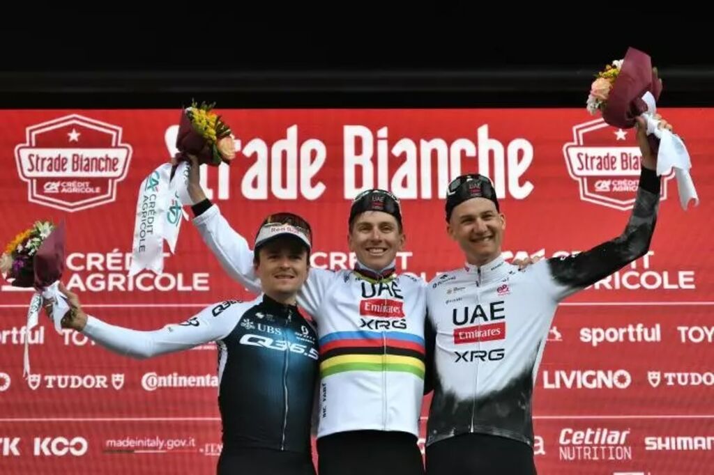| (De gauche à droite) Le Britannique Tom Pidcock, le Slovène Tadej Pogacar et le Belge Tim Wellens sur le podium de la 19e édition des Strade Bianche le 8 mars à Sienne. |