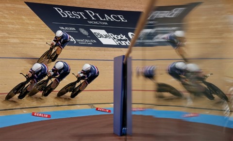 | L'équipe de France de poursuite lors des Mondiaux de cyclisme sur piste à Berlin, le 26 février. |