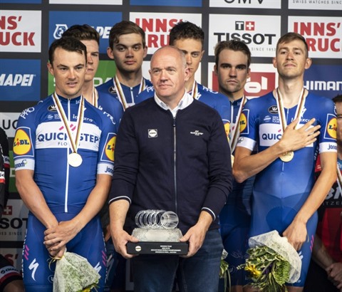 | L'équipe cycliste Quick-Step, sacrée championne du monde du contre-la-montre, le 23 septembre à Innsbrück (Autriche). |
