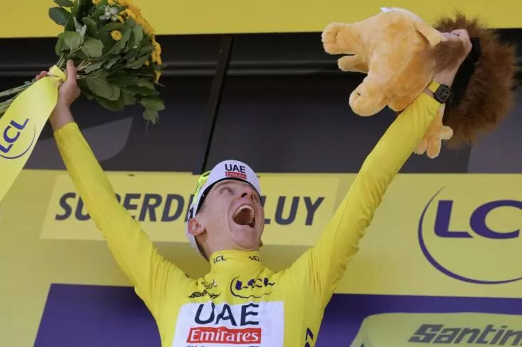 | Tadej Pogacar en jaune sur un podium du Tour de France, le 17 juillet à Superdévoluy. |