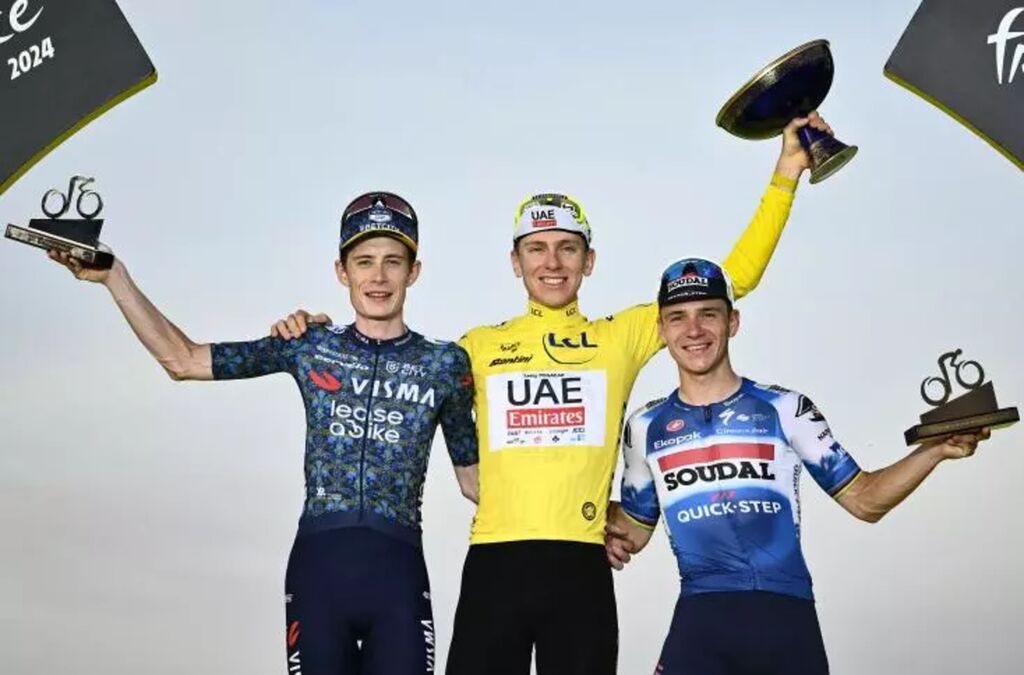 | Tadej Pogacar (centre), Jonas Vingegaard (gauche) et Remco Evenepoel sur le podium final du Tour de France, le 24 juillet à Nice. |