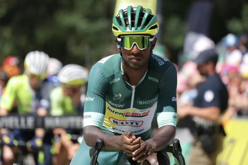 | Le sprinteur érythréen Biniam Girmay avec le maillot vert au départ de la 15e étape du Tour de France, le 14 juillet à Loudenvielle. |