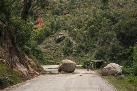 | Chute de rochers sur une route près de Ranomafana après le passage du cyclone Batsirai, le 7 février à Madagascar. |