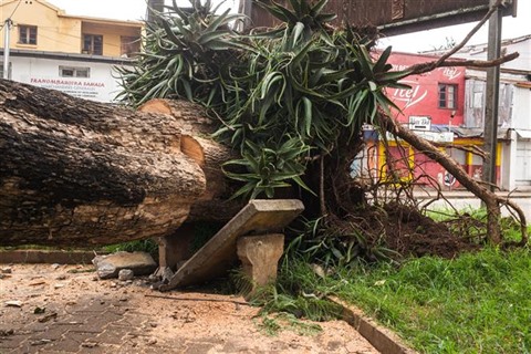 | Un arbre déraciné après le passage du cyclone Batsirai, à Madagascar, le 6 février. |