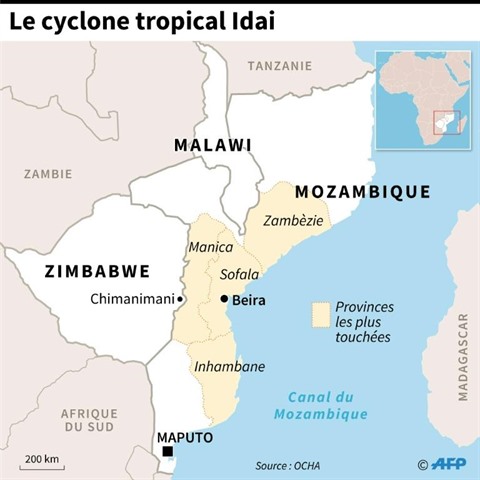 Des rescapés ont trouvé refuge dans des arbres en attendant les secours, a expliqué le président. Des images aériennes transmises par l'organisation Mission Aviation Fellowship montrent aussi des dizaines de personnes bloquées sur les toits de bâtiments en dur entourés d'eau. Le cyclone Idai et ses vents d'une extrême violence associés à des pluies torrentielles se sont abattus sur le centre du Mozambique jeudi soir, avant de poursuivre leur course au Zimbabwe voisin. Au Zimbabwe, le dernier bilan s'élevait à 98 morts et au moins 217 disparus, selon le ministère de l'Information.