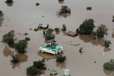 | Photo aérienne prise le 18 mars par la Mission Aviation Fellowship montrant des personnes ayant trouvé refuge sur un toit pour échapper aux inondations à Beira, au Mozambique. |