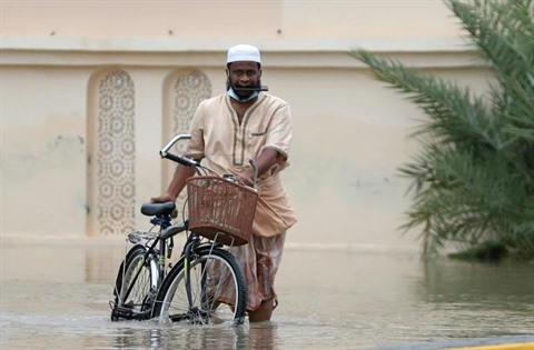 | Un homme se déplace dans une rue innondée à Mascate, la capitale d'Oman, après le passage du cyclone Shaheen, le 3 octobre |
