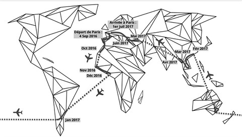 L’itinéraire est découpé en cinq grandes étapes qui traverseront l’Afrique, l’Amérique du Sud, l’Océanie, l’Asie, et l’Europe. Tout d’abord, ils ont débuté à Paris (France) pour se rendre jusqu’à Casablanca (Maroc) par le détroit de Gibraltar. Puis, ils se sont rendus à Dakar (Sénégal) pour rejoindre Cotonou (Bénin) en longeant le Golfe de Guinée. Ensuite, ils ont franchi la Cordillère des Andes de Buenos Aires (Brésil) à Santiago (Chili). Après une escale à Sydney (Australie), ils descendront de Taipei (Chine) à Bangkok (Thaïlande) en passant par le Vietnam, le Laos et le Cambodge. Enfin, pour leur dernier trajet, ils traverseront l’Europe d’Est en Ouest à partir d’Istanbul (Turquie) pour un retour à Paris le 1er juillet 2017.