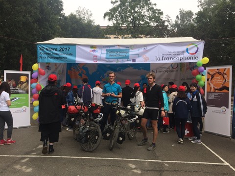 | Edouard Delbende (centre) et Charlélie Lecanu de passage avec leur vélo au stand de l’OIF à l’Université de Hanoï, le 11 mars 2017. |