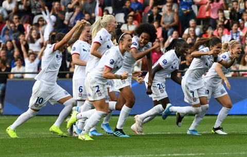 | Les Lyonnaises après leur succès contre le PSG lors du Trophée des championnes, le 21 septembre 2019 à Guingamp. |