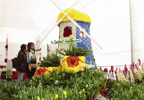 | Un moulin à vent entièrement en fleurs fraîches, présentée aux Floralies de Dà Lat 2012. |