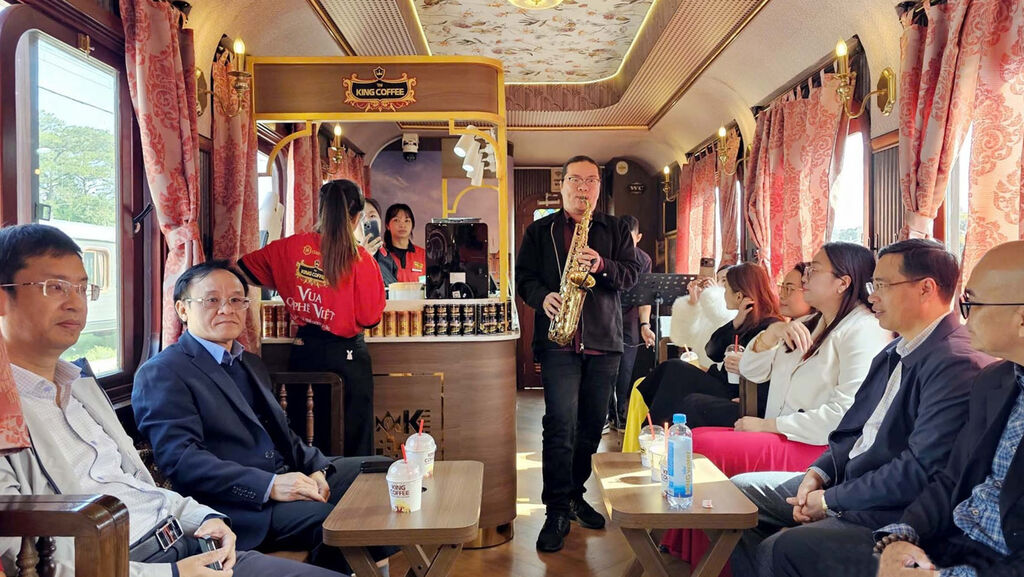 | À bord du " Đà Lạt Coffee Train", les touristes savourent un café en musique. |
