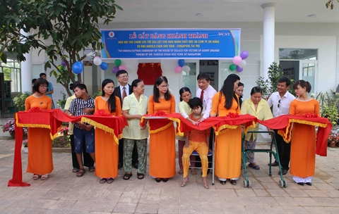 | Des jeunes, victimes de l'agent orange, coupent la bande d'inauguration de la maison pour les enfants paralysés. |