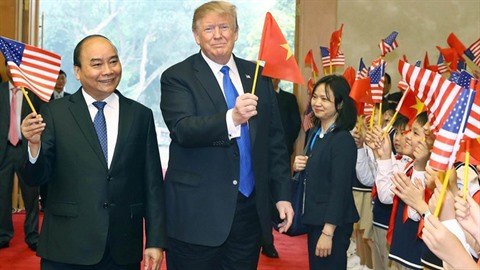 | Le Premier ministre Nguyên Xuân Phuc (gauche) et le président américain Donald Trump qui a effectué une visite au Vietnam, en 2019. |